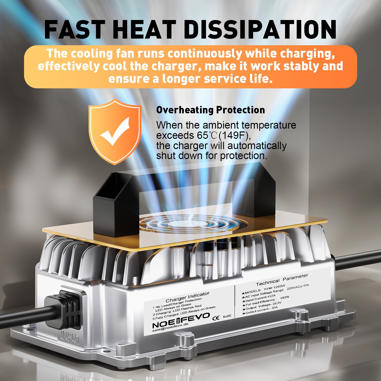 המטען הזה מיועד לסוללות ליתיום-ברזל-פוספט 24V (25.6V) עם זרם טעינה של 30A. הוא טוען סוללה של 100Ah במלואה תוך 3.4 שעות בלבד. מטעמי בטיחות, המטען נכבה אוטומטית לאחר סיום הטעינה. המטען מוסמך CE, RoHS ו-FCC, ומגיע עם אחריות של שנתיים שמבטיחה איכות ובטיחות.